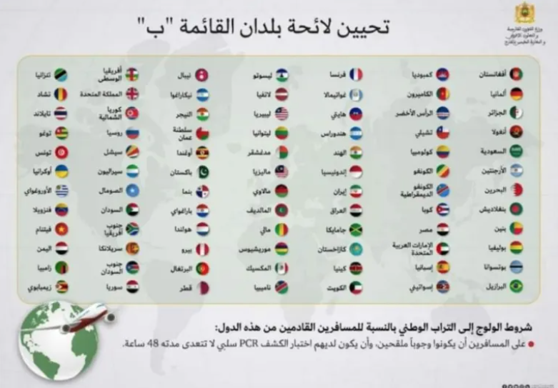 قامت اللجنة بين الوزارية للتنسيق وتتبع لوائح الأسفار الدولية خلال جائحة كوفيد-19 بتحديث هذه اللوائح على ضوء آخر التطورات المتعلقة بالوضعية الوبائية في المغرب والعالم. وأشارت اللجنة، في بلاغ، إلى أن تصنيف البلدان وفق اللوائح (أ) و (ب) وكذا شروط الولوج إلى التراب الوطني، يتم وضعه بناء على معطيات موثوقة من الإدارات الصحية في الدول والمنظمات الدولية.