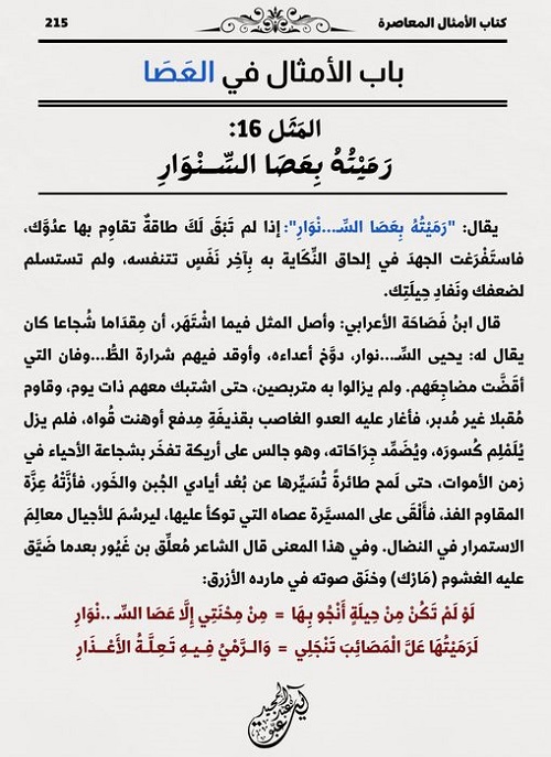قال ابنُ فَصَاحَة الأعرابي: وأصل المثل فيما اشْتَهَر، أن مِقدَاما شُجاعا كان يقال له: يحيى السِّنوار، دوَّخ أعداءه، وأوقد فيهم شرارة الطُّ…وفان التي أقَضَّت مضاجِعَهم. ولم يزالوا به متربصين، حتى اشتبك معهم ذات يوم، وقاوم مُقبلا غير مُدبر، فأغار عليه العدو الغاصب بقذيفَةِ مِدفع أوهنت قُواه، فلم يزل يُلَمْلِم كُسورَه، ويُضَمِّد جِرَاحَاته، وهو جالس على أريكة تفخَر بشجاعة الأحياء في زمن الأموات، حتى لَمح طائرةً تُسَيِّرها عن بُعْد أيادي الجُبن والخَور، فأزَّتْهُ عِزَّة المقاوم الفذ، فأَلْقَى على المسيَّرة عصاه التي توكأ عليها، ليرسُمَ للأجيال معالِمَ الاستمرار في النضال.