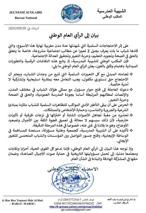 أعلن المكتب الوطني لجمعية الشبيبة المدرسية عن تضامنه المبدئي مع كل التعبيرات السلمية التي تنبع من وجدان الشباب، واعتبر أن الاحتجاج حق دستوري مكفول، يجب التعامل معه بمقاربة استيعابية وتشاركية لا أمنية خاصة.