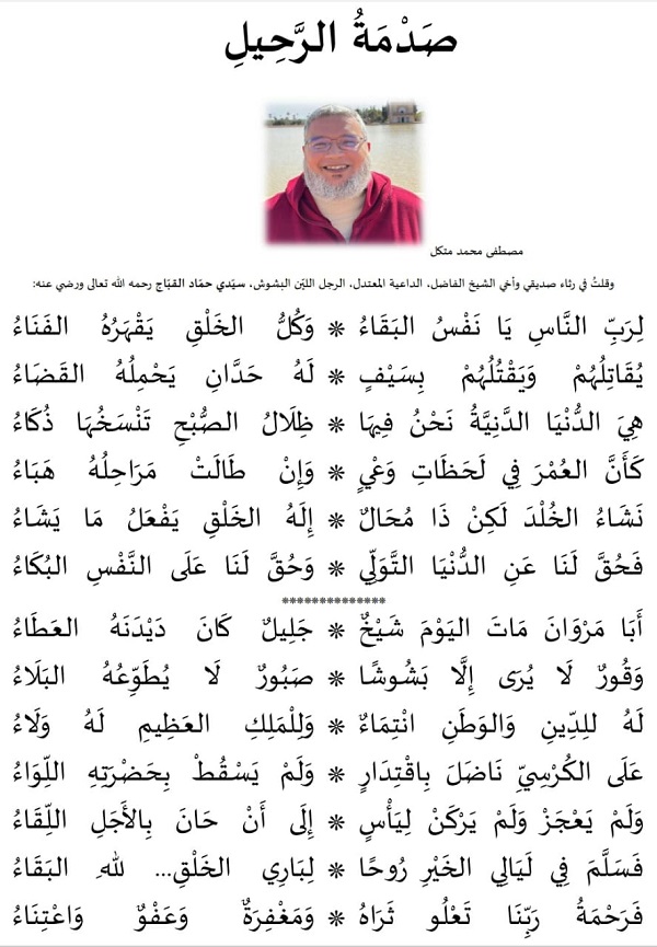 من جهته رثاه الشاعر مصطفى محمد متكل بهذه القصيدة، تحت عنوان “صدمة الرحيل”: