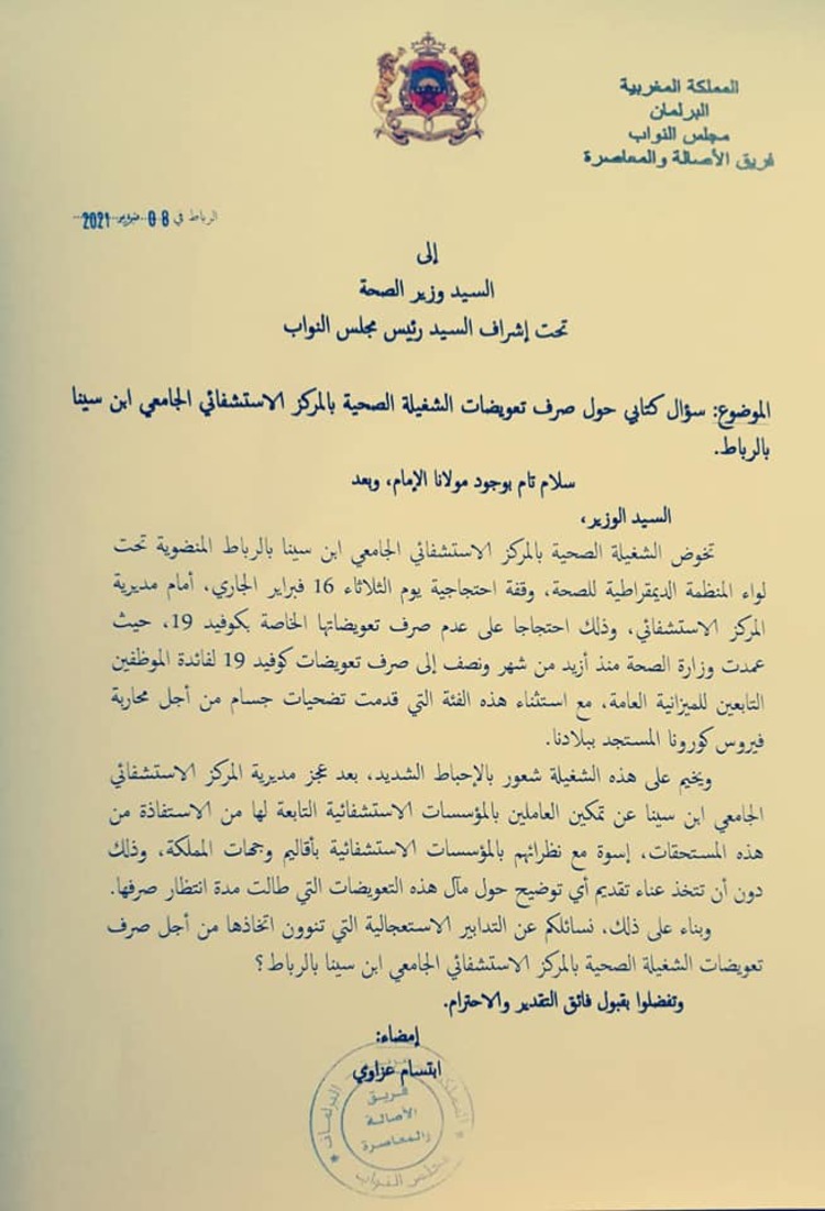 هذا وتساءلت النائبة البرلمانية، عن التدابير الاستعجالية التي يعتزم وزير الصحة اتخاذها من أجل صرف تعويضات الشغيلة الصحية بالمركز الاستشفائي الجامعي ابن سينا بالرباط.