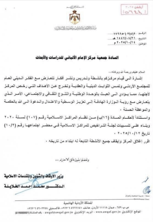 ■ وإنه لمن المؤسف أن تـقْـدِم دولة الأردن، التي كانت مهد النشاط العلمي للشيخ الألباني ومركز إشعاعه الحديثي، على إغلاق مركز علمي كان تابعا لمدرسته الفكرية والعلمية؛ إذ كان الأجدر دعم مثل هذه المؤسسات التي تجسد الاعتدال المنهجي، وتسهم في ترسيخ العلم والوسطية، بدل التضييق على رموز الاعتدال ومنارات الإصلاح.