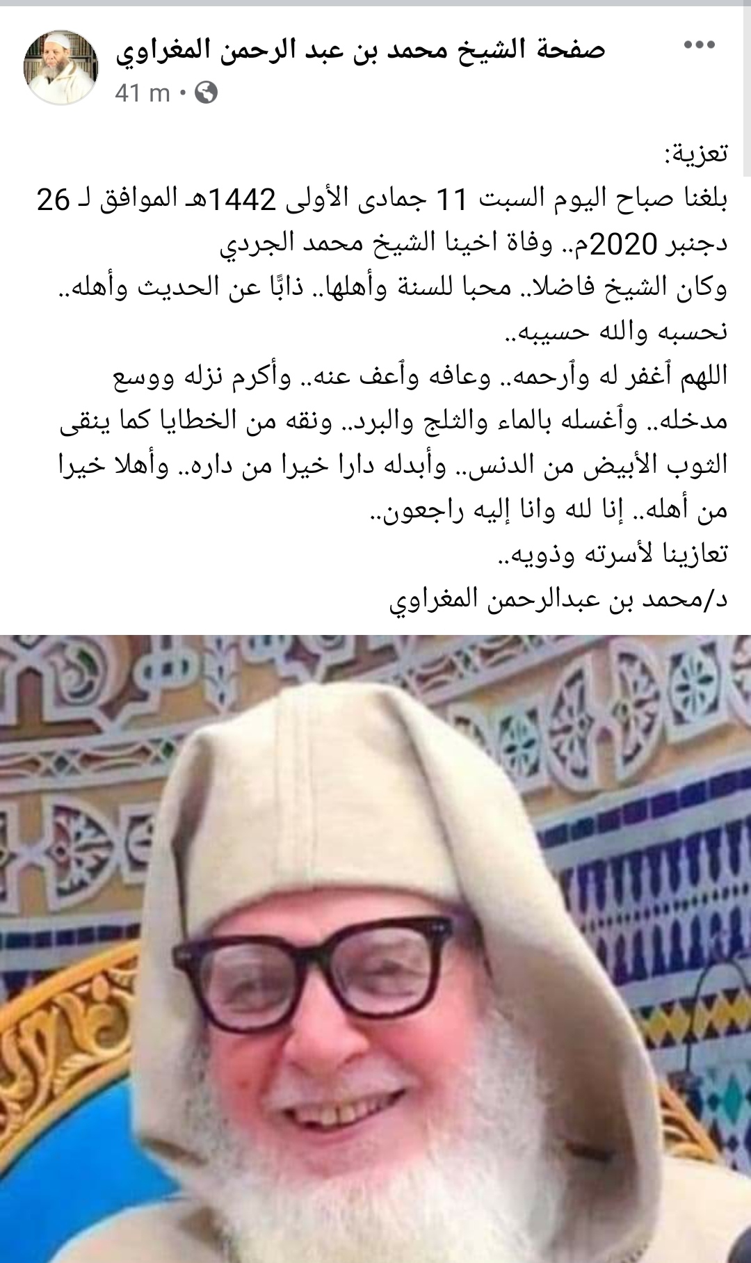 تقدم الشيخ محمد المغراوي بعزيته في وفاة العالم المغربي محمد الجردي، الذي وافته المنية صباح اليوم السبت 26 دجنبر الجاري، داعيا له بالمغفرة والرحمة والعفو، ولأهله بالخير إن شاء الله.