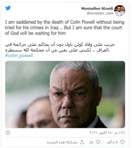 وكتب الزيدي على حسابه على تويتر “حزنت على وفاة كولن باول من دون أن يحاكم على جرائمه في العراق، لكنني على يقين من أن محكمة الله ستنتظره”.