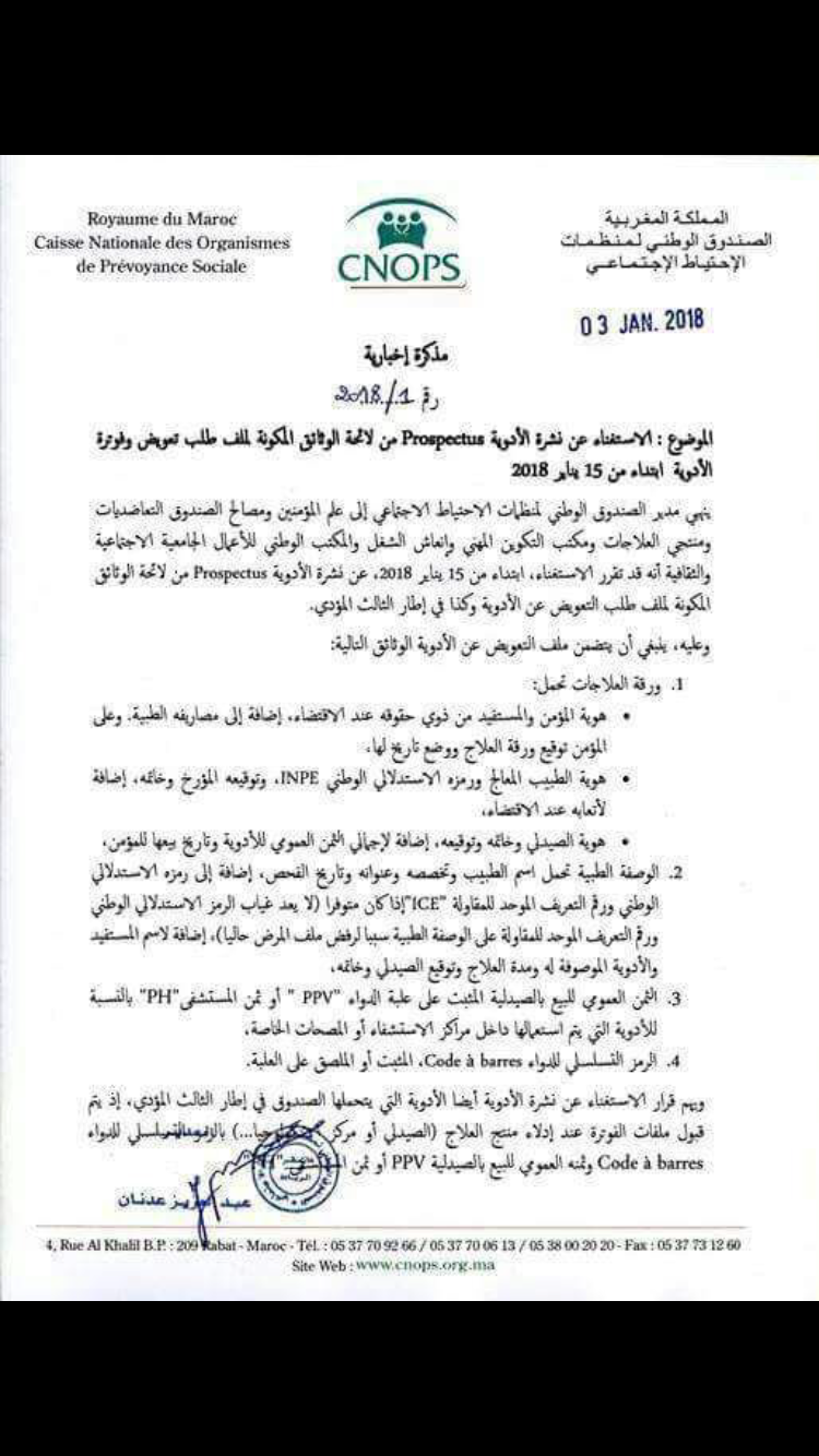 وأعلن الصندوق في المذكرة الإخبارية رقم 2018/1 أنه ينبغي أن يتضمن ملف التعويض عن الأدوية ورقة العلاجات التي تحمل هوية المؤمن والمستفيد من ذوي حقوقه عند الاقتضاء، إضافة إلى مصاريفه الطبية.