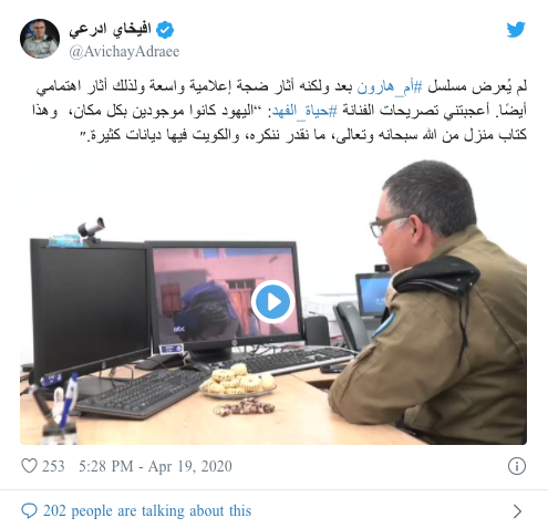 وقال الصهيوني “أدرعي”، في تغريدة  نشرنها على حسابه الشخصي على تويتر، إن “مسلسل أم هارون لم يُعرض بعد ولكنه أثار ضجة إعلامية واسعة ولذلك أثار اهتمامي أيضًا »، مشيدا بتصريحات حياة الفهد عن أن اليهود كانوا موجودين في كل مكان وأن الكويت فيها ديانات كثيرة”.