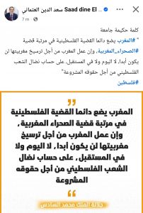 نشر رئيس الحكومة السابق والأمين العام الأسبق لحزب العدالة والتنمية، سعد الدين العثماني، مقتطف من خطاب الملك محمد السادس حول قضية الصحراء وقضية فلسطين الوطنيتين.