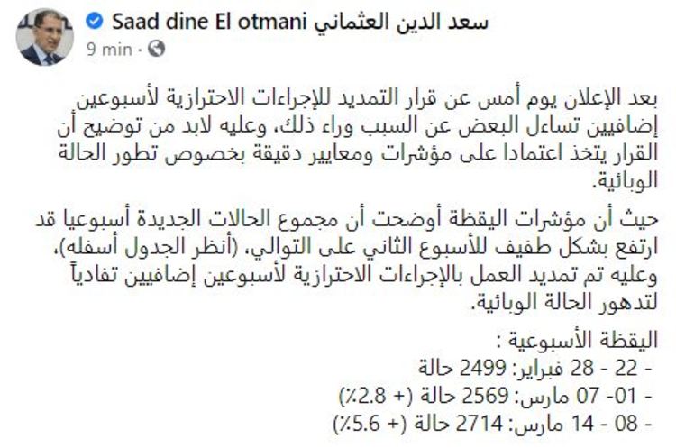 وأضاف العثماني، في منشور رسمي على مواقع التواصل الاجتماعي، “حيث أن مؤشرات اليقظة أوضحت أن مجموع الحالات الجديدة أسبوعيا قد ارتفع بشكل طفيف للأسبوع الثاني على التوالي، وعليه تم تمديد العمل بالإجراءات الاحترازية لأسبوعين إضافيين تفادياً لتدهور الحالة الوبائية”.