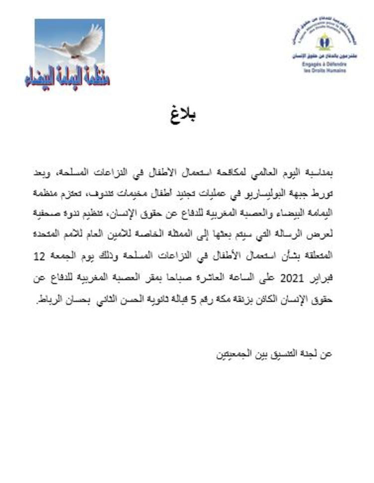 نظمت العصبة المغربية للدفاع عن حقوق الإنسان، بتعاون مع منظمة “اليمامة البيضاء” ندوة صحفية، صبيحة يوم الجمعة، خصصت لتسليط الضوء على أهم ما تضمنته الرسالة التي تم  رفعها إلى السيدة “فرجينيا غامبا” الممثلة الخاصة للأمين العام للأمم المتحدة المعنية بالأطفال والنزاع المسلح.