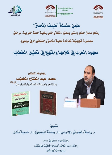 ينظم ماستر النحو والنص ومختبر اللغة والنص بكلية اللغة العربية بمراكش محاضرة تكوينية لفائدة طلبة الماستر و الدكتوراة في موضوع: “معهود العرب في كلامها والمنهج في تحليل الخطاب” وذلك يوم 06 أبريل 2022 ابتداء من الساعة العاشرة صباحا بتوقيت غرينتش بمدرج الشرقاوي إقبال.