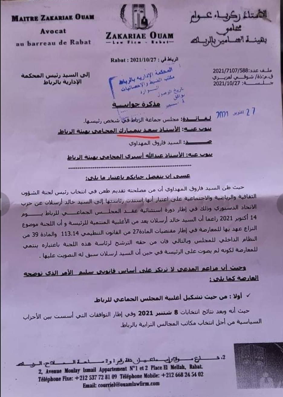 – يتعلق الأمر بقضية مرفوعة ضد الجماعة، وليس ضد السيدة أسماء اغلالو بصفتها الشخصية، لأن مضمون الدعوى يتعلق بالطعن في المقرر الذي اتخذه المجلس يوم: 14 أكتوبر 2021، والقاضي بانتخاب أحد الزملاء من المجلس، رئيسا للجنة المكلفة بالشؤون الثقافية، والأمر هنا لا يتعلق بقضية من قضايا الطعون الانتخابية كما تدعي الرئيسة من خلال بلاغها، وإنما يتعلق كما سبق بالطعن في مقرر يهم المجلس.