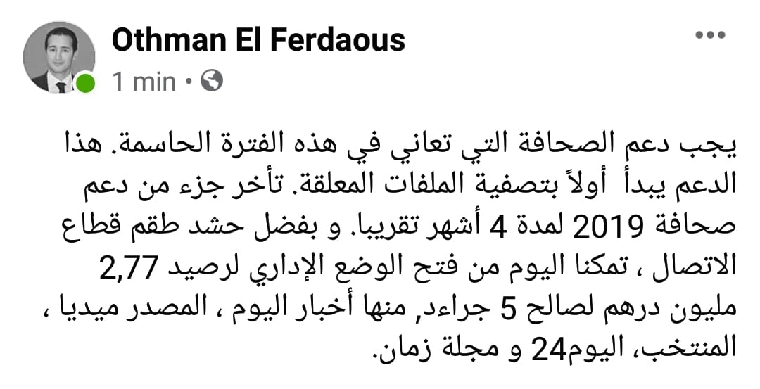 ومن خلال تدوينة له على صفحته بالفيسبوك قال الفردوس الذي عين قبل أيام مكان الحسن عبيابة “يجب دعم الصحافة التي تعاني في هذه الفترة الحاسمة. هذا الدعم يبدأ أولاً بتصفية الملفات المعلقة. تأخر جزء من دعم صحافة 2019 لمدة 4 أشهر تقريبا. و بفضل حشد طقم قطاع الاتصال ، تمكنا اليوم من فتح الوضع الإداري لرصيد 2,77 مليون درهم لصالح 5 جراءد, منها أخبار اليوم ، المصدر ميديا ، المنتخب، اليوم24 و مجلة زمان”.