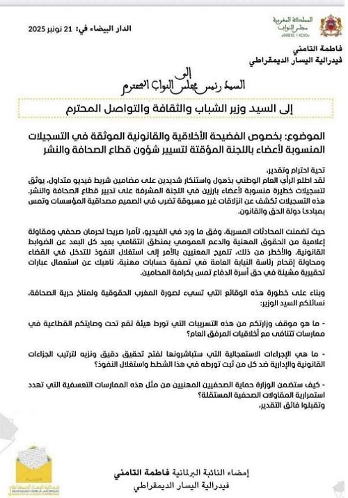 وجّهت البرلمانية فاطمة التامني، عضو فريق فيدرالية اليسار الديمقراطي بمجلس النواب، مراسلة رسمية إلى وزير الشباب والثقافة والتواصل تطلب فيها فتح تحقيق عاجل حول ما وصفته بـ“الفضيحة الأخلاقية والقانونية الموثقة” والمتعلقة بفيديو متداول يظهر أحد أعضاء اللجنة المؤقتة لتسيير شؤون قطاع الصحافة والنشر في وضع مخلّ.