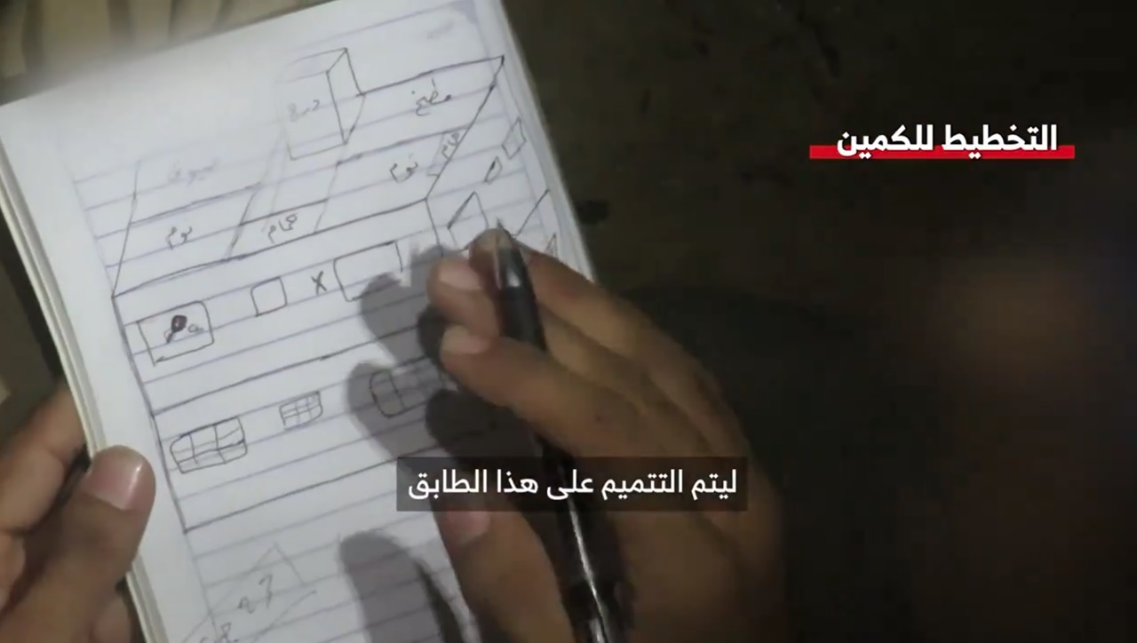 وشرح أحد مقاتلي القسام خطة الكمين على ورقة بيضاء، موضحًا المبنى المستهدَف، لافتا إلى الطابق الذي كان فيه 23 جنديًّا إسرائيليًّا، إضافة إلى قوات خاصة إسرائيلية كانت تتمركز في غرفة محددة داخل المبنى.
