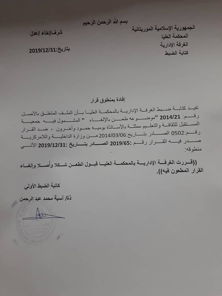ألغت الغرفة الإدارية بالمحكمة العليا قرار إغلاق جمعية المستقبل للدعوة والثقافة والتعليم والتي يرأسها العلامة الشيخ محمد الحسن ولد الددو.