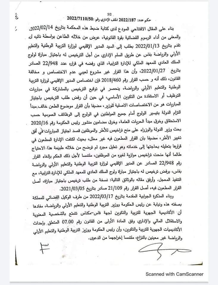 وكان الأستاذ المعني قد تقدم بتاريخ 13/01/2022 بطلب إلى السيد المدير الإقليمي لوزارة التربية الوطنية والتعليم الأولي والرياضة بفاس عن طريق السلم الإداري من أجل الترخيص له باجتياز مباراة لولوج السلك العادي للمعهد الملكي للإدارة الترابية، والذي رفضه المدير الإقليمي في قراره عدد 22/948 الصادر بتاريخ 27/01/2022، معللا قراره بحاجة المؤسسة والسلك إلى خدماته، رغم أن الأستاذ نفسه سبق واستفاد من رخصة باجتياز مباراة ولوج مفتش الشغل دورة 11 أبريل 2021.