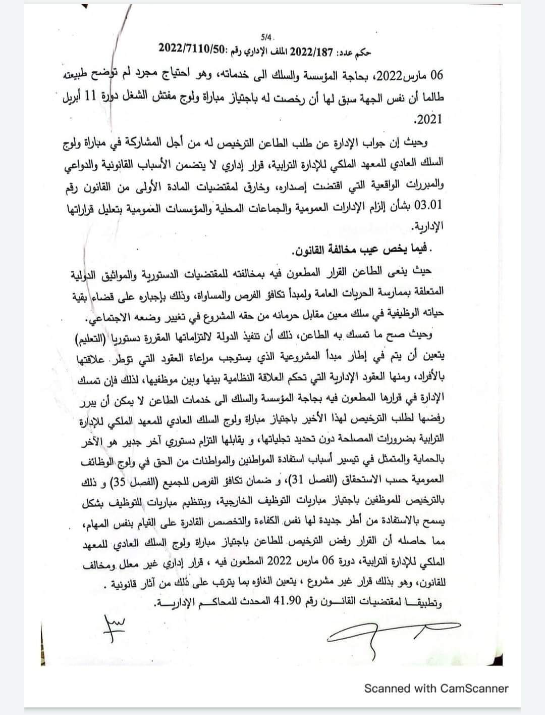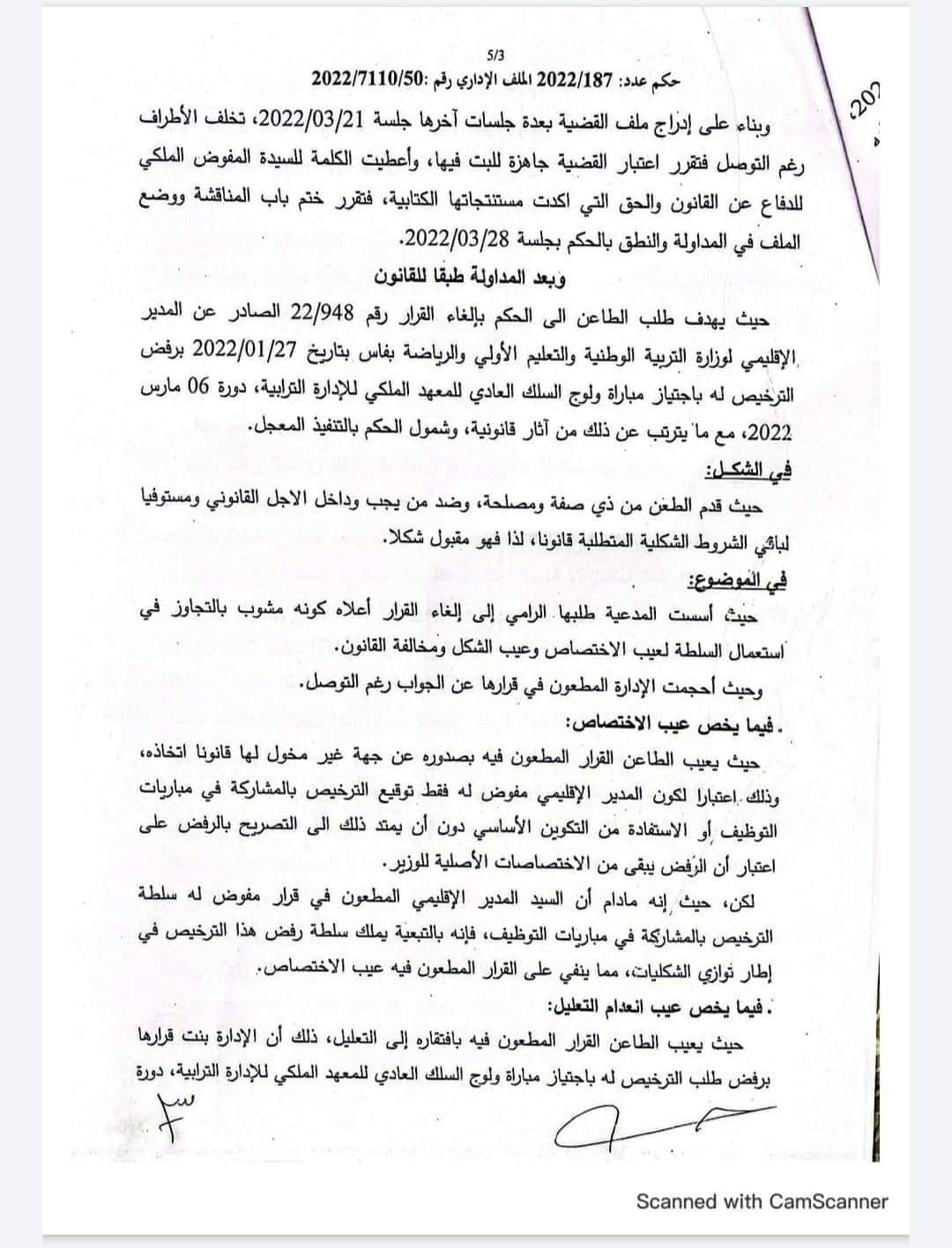 لتقرر المحكمة الإدارية علنيا، ابتدائيا وحضوريا: في الشكل، بقبول الطلب. وفي الموضوع بإلغاء القرار الصادر عن المدير الإقليمي للمديرية الإقليمية لوزارة التربية الوطنية والتعليم الأولي والرياضة تحت رقم 22/948 وتاريخ 27 يناير 2022 برفض الترخيص للطاعن باجتياز مباراة ولوج السلك العادي للمعهد الملكي للإدارة الترابية دورة 06 مارس 2022، مع ما يترتب عن ذلك من آثار قانونية.