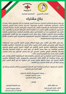 وإن مجموعة العمل الوطنية من أجل فلسطين والكونفدرالية الديمقراطية للشغل يؤكدان على رفض وإدانة ومقاومة كل أشكال التآمر الاستعماري والصهيوني، بأسم الانفصالات وتقسيم الأقطار العربية في سوريا والعراق واليمن ولبنان في المشرق كما في أقطار المغرب التي يبذرون فيها كل بذور الفتنة والحروب بين اقطارها.