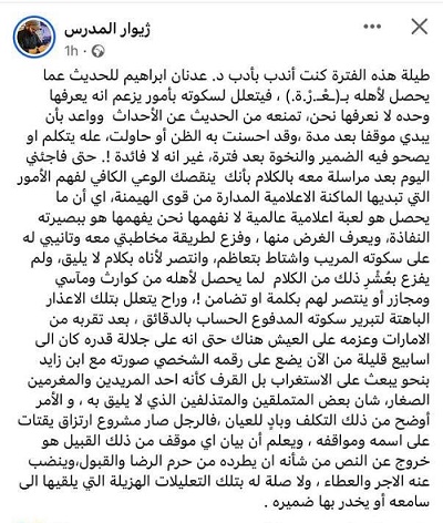 الكنبوري يكشف صمت وتخاذل عدنان إبراهيم في الدفاع عن غزة