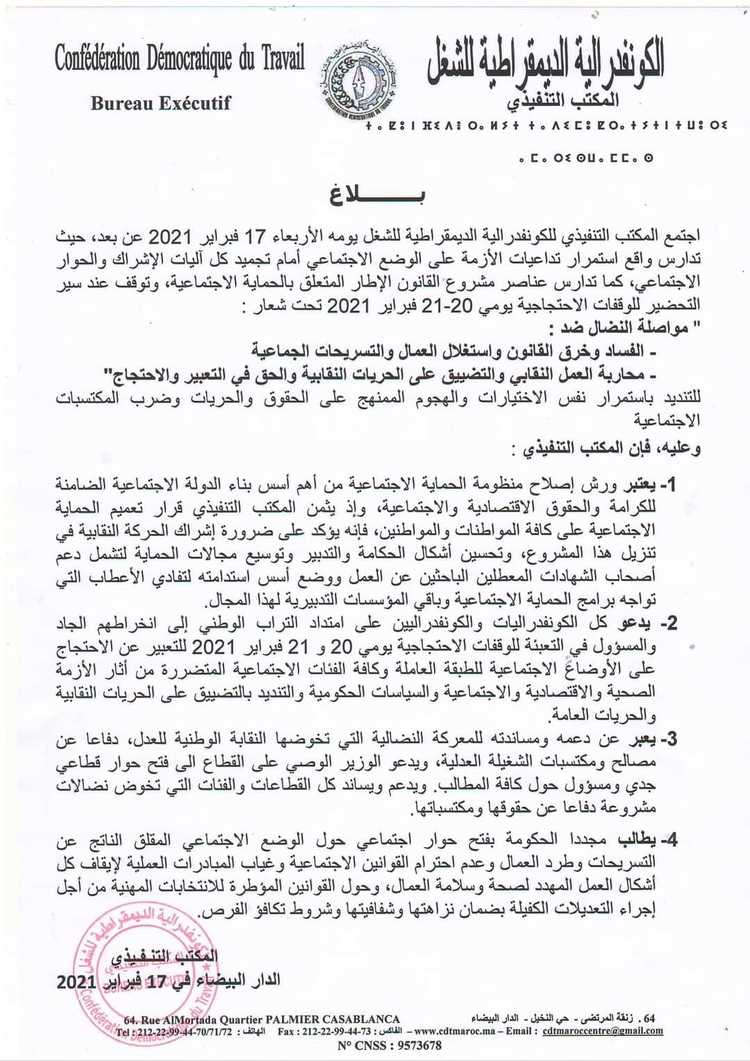 وبخصوص الاحتجاجات التي دعت لها النقابة تخليدا لذكرى 20 فبراير، دعا البلاغ إلى الانخراط الجاد والمسؤول في التعبئة للوقفات يومي 20 و21 فبراير الجاري، للتعبير عن الاحتجاج على الأوضاع الاجتماعية للطبقة العاملة، وكافة الفئات الاجتماعية المتضررة، والتنديد بالتضييق على الحريات النقابية والحريات العامة.