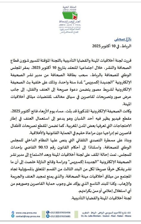 فحسب بلاغ المجلس “قررت لجنة أخلاقيات المهنة والقضايا التأدييبية باللجنة المؤقتة لتسيير شؤون قطاع الصحافة والنشر، خلال اجتماعها المنعقد بتاريخ 10 أكتوبر 2025، بمقر المجلس الوطني للصحافة بالرباط، سحب بطاقة الصحافة من مدير نشر الصحيفة الإلكترونية “الجديدة إكسبريس” لمدة سنة واحدة، وذلك على خلفية بث الصحيفة الإلكترونية لشريط مصور يتضمن دعوة صريحة إلى العنف والقتل، إلى جانب عرض صور وتصريحات لقاصرين في سياق مخالف لمقتضيات ميثاق أخلاقيات المهنة.