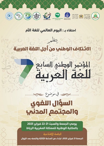ينظم الائتلاف الوطني من أجل اللغة العربية، المؤتمر الوطني السابع للغة العربية في موضوع: “السؤال اللغوي والمجتمع المدني” يومي الجمعة والسبت 21 و22 فبراير 2025، بالمكتبة الوطنية للمملكة المغربية بالرباط.