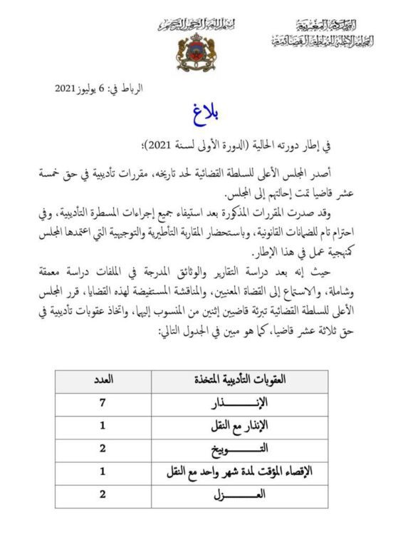 أصدر المجلس الأعلى للسلطة القضائية مقررات تأديبية في حق 15 قاضيا، تمت إحالتهم على المجلس التأديبي.