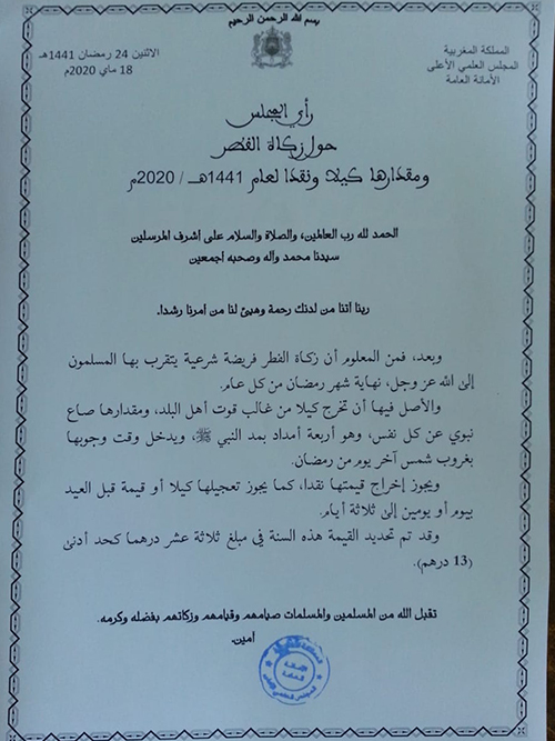 أعلن المجلس العلمي الأعلى عبر بلاغ له عن رأيه حول زكاة الفطر ومقدارها كيلا ونقدا لعام 1441 هـ/2020م.