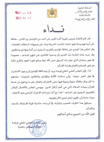 ونبَّه المجلس العلمي المحلي لوجدة، من خلال بلاغ وقعه رئيسه الدكتور مصطفى بنحمزة، كافة المؤمنين إلى وجوب الاستمرار في فعل الخير عموما، ومساندة الأئمة والمؤذنين والمنظفين خصوصا، بمنحهم ما كان يمثل مكافأة سنوية ومعنوية فيها معنى الاعتراف والشكر على ما يبذلون من خدمة القرآن وعبادة الصلاة التي هي أهم أركان الدين.
