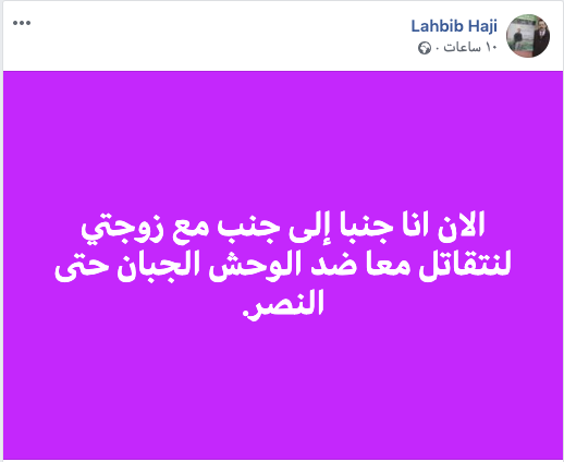 وقال “الحبيب حجي” في تدوينة: “الآن أنا جنبا إلى جنب مع زوجتي لنقاتل معا ضد الوحش الجبان حتى النصر”.