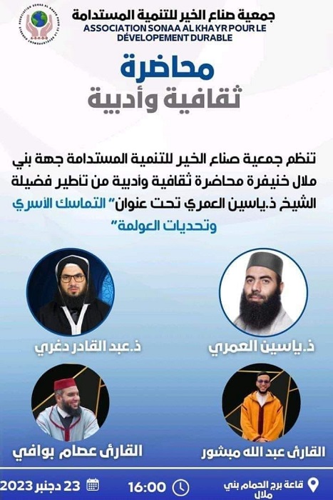 علمت “هوية بريس” أن المحاضرة التي نظمتها جمعية صناع الخير للتنمية المستدامة ببني ملال، بعنوان “التماسك الأسري وتحديات العولمة”، والتي شارك فيها كل من الأستاذين ياسين العمري وعبد القادر دغري، والمقرئين عصام بوافي وعبد الله مبشور، تكفّل تطوعا بكراء قاعتها أحد المحسنين من المدينة.