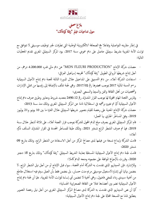 وجاء في بلاغ المركز السينمائي المغربي، أنه عاين الشريط السينمائي المعني، مباشرة بعد النقاش الذي أثير حوله، تبين للجنة النظر في صلاحية الأشرطة السينمائية، أن الموسيقى التي تم استغلالها في العمل السينمائي تعود فعلا للمغنية الانفصالية “مريم منت حسان”، وليس للمغني “فاضول” كما هو وارد بالسيناريو المُحال على المركز ولجنة الدعم.