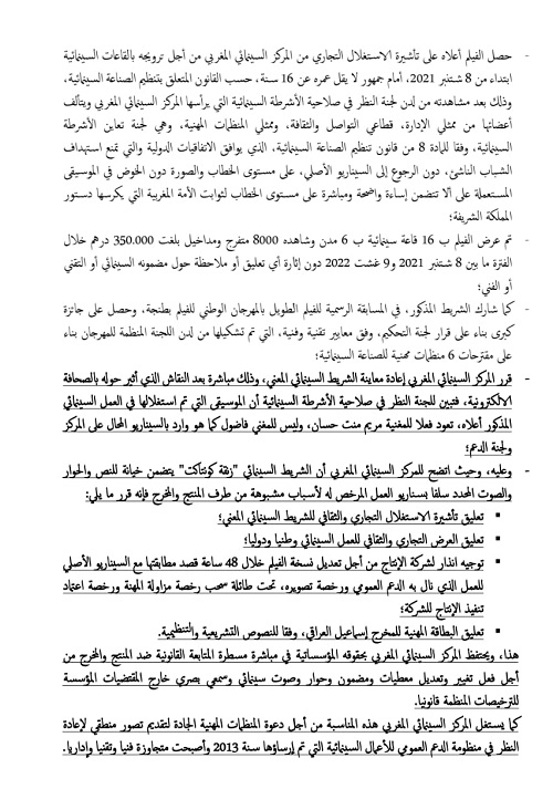 وتابع المركز في بلاغه، أنه يستغل هذه المناسبة من أجل دعوة المنظمات المهنية الجادة لتقديم تصور منطقي لإعادة النظر في منظومة الدعم العمومي للأعمال السينمائية التي تم إرساؤها سنة 2013 وأصبحت متجاوزة فنيا وتقنيا وإدارياً.