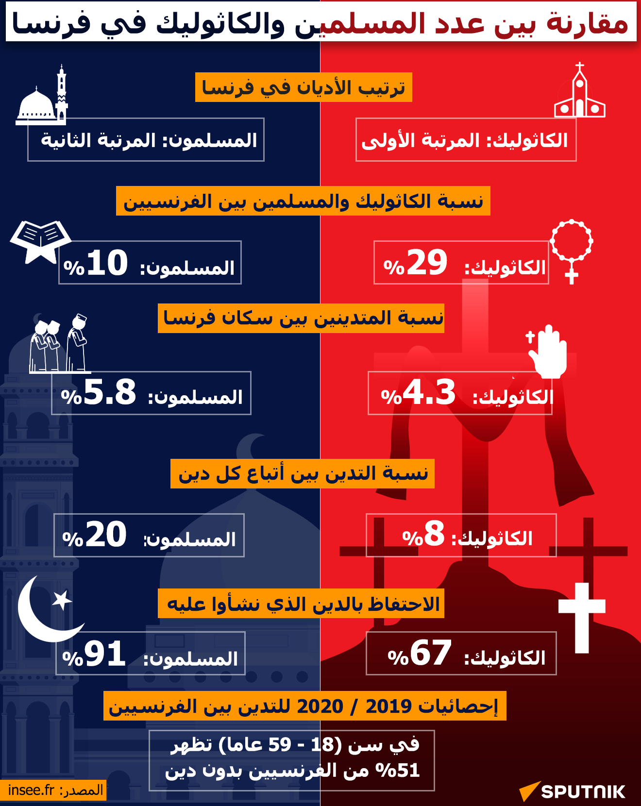 ويمثل الكاثوليك نسبة 29 في المائة من سكان فرنسا، بينما يمثل المسلمون 10 في المائة، وتشير إحصاءات 2019 / 2020 لنسبة التدين بين سكان فرنسا، الذين تتراوح أعمارهم بين (18 – 59 عاما) إلى أن 51 في المائة من الفرنسيين يقولون إنهم لا يتبعون دينا معينا.