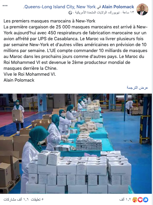 ونشر الإعلامي الفرنسي المقيم في الولايات المتحدة “ألان بولوماك” تدوينة يبن فيها أن أمريكا توصلت بإل شحنة من الأقنعة المغربية، مع أجهزة التنفس مغربية الصنع كذلك.