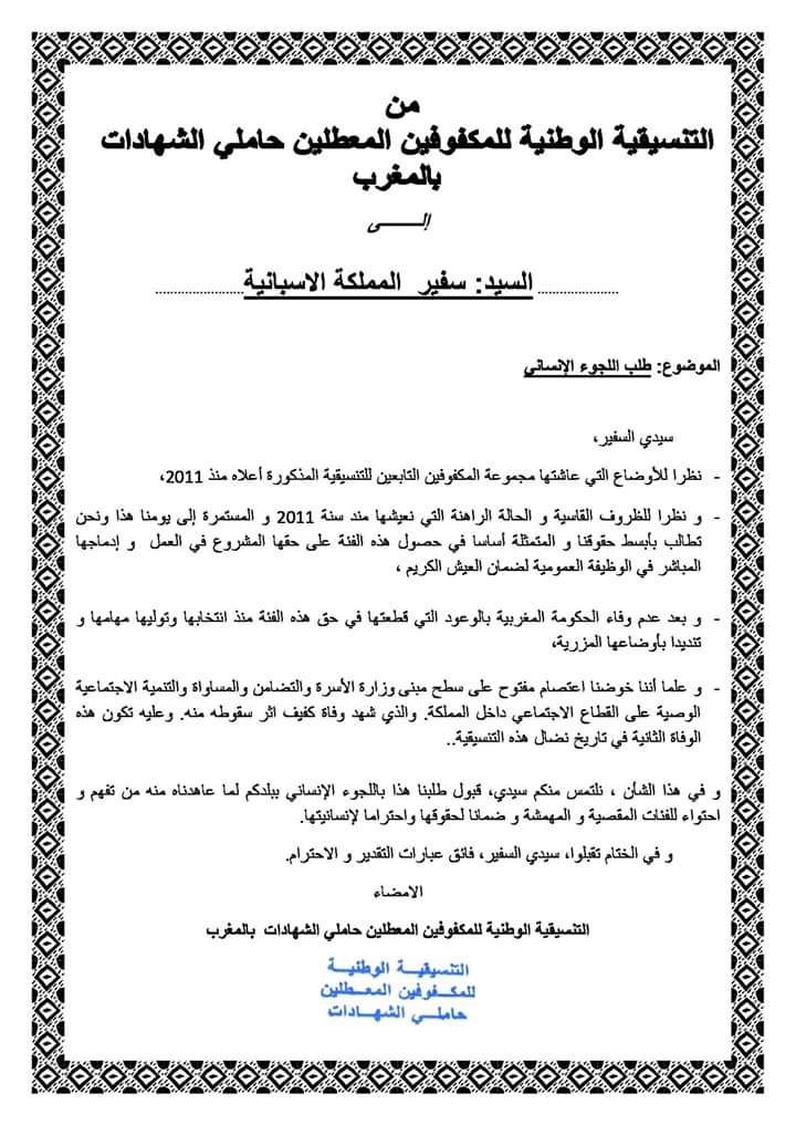 هذا، وسبق للمكفوفين المنتمين للتنسيقية أن هددوا بطلب اللجوء إلى إسبانيا أوائل هذا الشهر من خلال نشر مشروع الرسالة على صفحتهم “الفايسبوكية”، قبل أن يتخذوا الخطوة بشكل رسمي.