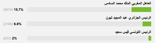 وتبين النتائج الأولية لحدود نهار اليوم تفوق الملك محمد السادس على الرئيس الجزائري عبد المجيد تبون وعلى الرئيس التونسي قيس سعيد أيضا، وبفارق كبير.