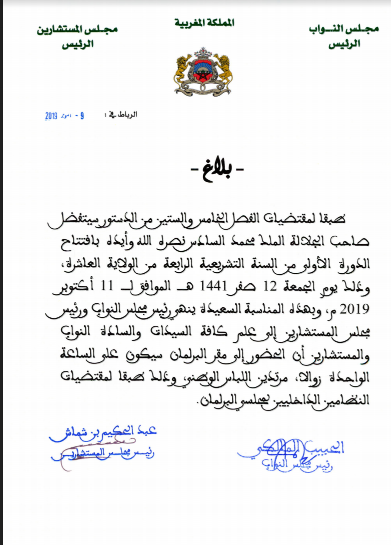 توصل موقع هوية بريس ببلاغ مزدوج بين مجلس النواب ومجلس المستشارين، ويخبر البلاغ أن الملك محمد السادس وطبقا لمقتضيات الفصل الخامس والستين من الدستور المغربي سيفتتح الدورة الأولى من الستة التشريعية الرابعة من الولاية العاشرة.