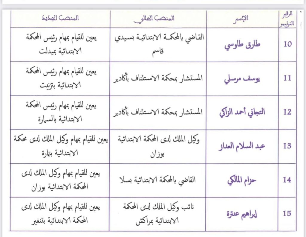 وقد شملت هذه التعيينات، تعيين رئيسين أولين (02) لمحكمتي استئناف، كانا يشغلان مهمة رئيس محكمة ابتدائية؛ وتسعة (09) رؤساء المحاكم ابتدائية، خمسة. كانوا يشغلون نفس المهمة، وأربعة (04) وكلاء للملك لدى محاكم ابتدائية، واحدٌ منهم كان يشغل نفس المهمة.