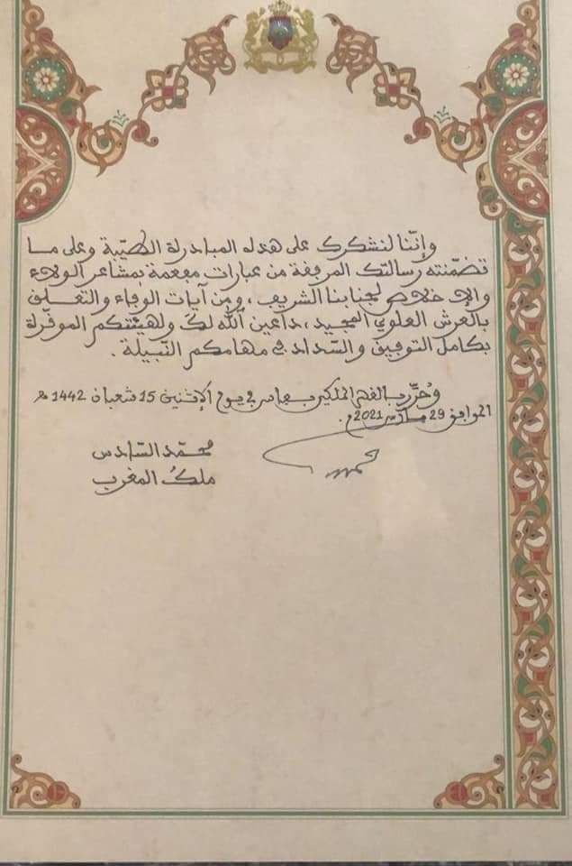 تلقت الهيأة الوطنية للعدول رسالة من الملك محمد السادس، يعبر فيها عن تلقيه بترحيب “للوحة الهيأة التي تتضمن تجديد وثيقة البيعة”.