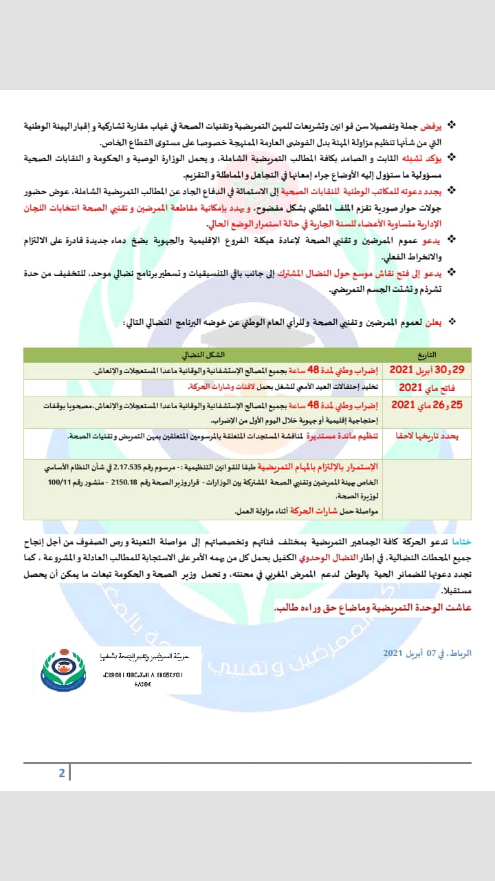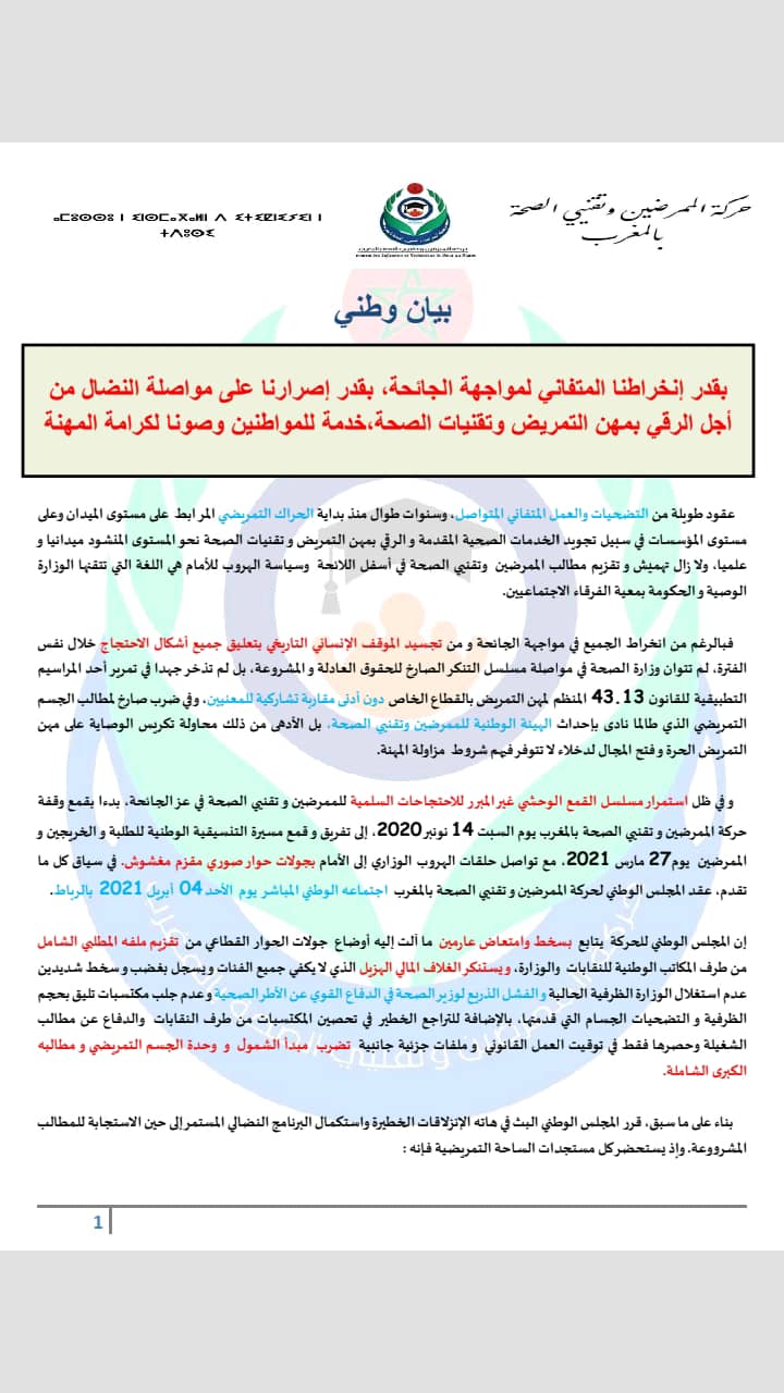 وعبرت الحركة، عن رفضها سن قوانين وتشريعات للمهن التمريضية وتقنيات الصحة، في غياب مقاربة تشاركية وإقبار الهيئة الوطنية التي من شاءنها تنظيم مزاولة المهنة.