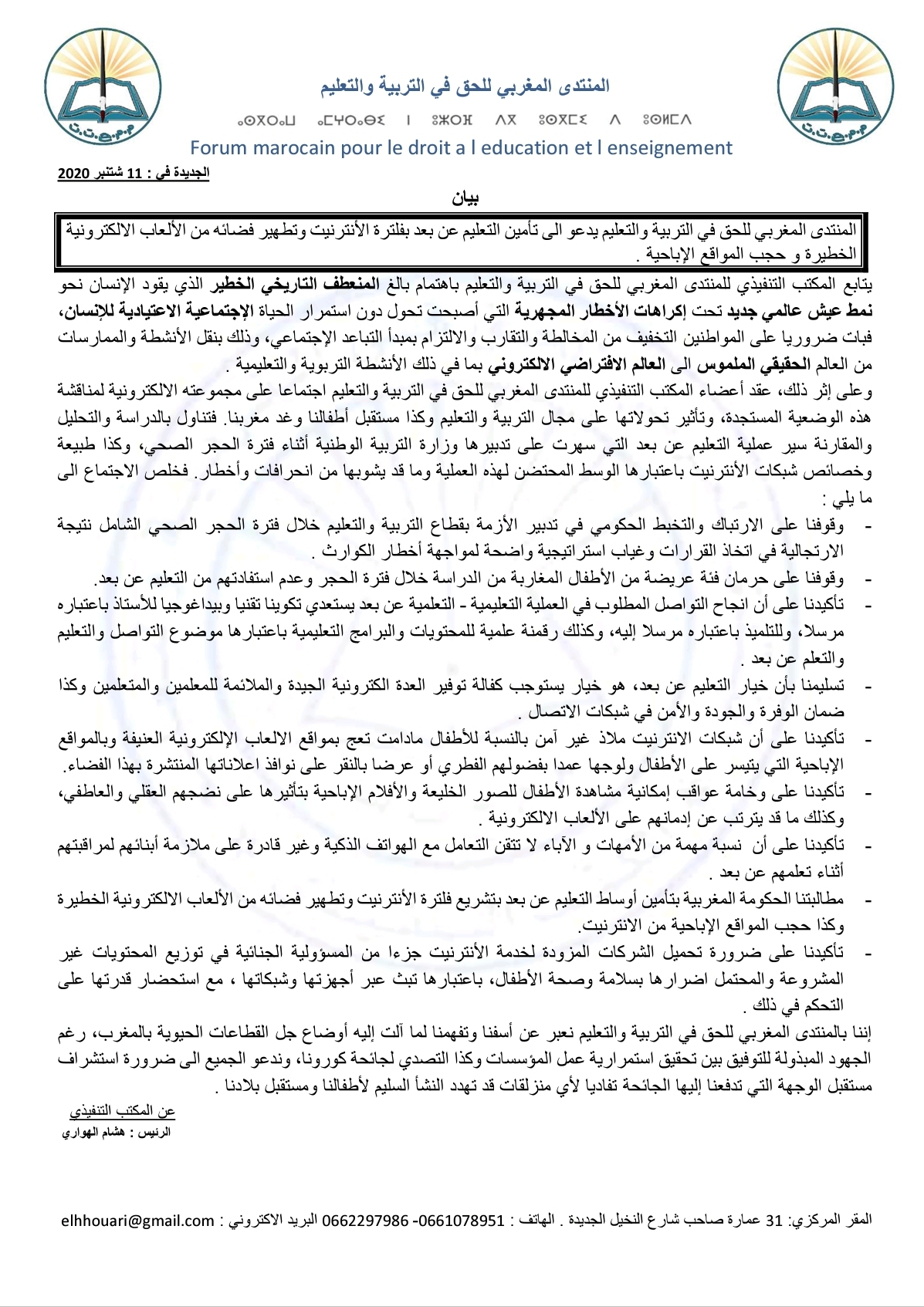 -مطالبتنا الحكومة المغربية بتأمين أوساط التعليم عن بعد بتشريع فلترة الأنترنيت وتطهير فضائه من الألعاب الالكترونية الخطيرة وكذا حجب المواقع الإباحية من الانترنيت.
