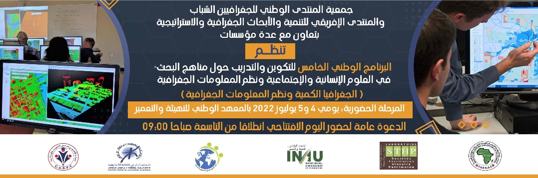 تنظم جمعية المنتدى الوطني للجغرافيين الشباب البرنامج الوطني للتكوين والتدريب حول مناهج البحث والعلوم الإنسانية والاجتماعية ونظم المعلومات الجغرافية في نسخته الخامسة خلال أيام 04-05-06 يوليوز 2022م بمدينة الرباط موقع العرفان، وذلك بمقر المعهد الوطني للتهيئة والتعمير INAU بتعاون مع هذا الأخير بالإضافة للمعهد الملكي للثقافة الأمازيغية والمنتدى الإفريقي للتنمية والأبحاث الجغرافية والإستراتيجية (منتدى الجغرافيين الشباب سابقا) ومختبر المجتمعات الترب التاريخ والتراث والمركز الأكاديمي للدعم والتكوين والاستشارة.