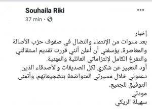 وقالت سهيلة الريكي في حسابها الفيسبوكي: “بعد سنوات من الانتماء والنضال في صفوف حزب الأصالة والمعاصرة، يؤسفني أن أعلن أنني قررت تقديم استقالتي والتفرغ الكامل لالتزاماتي العائلية والمهنية”.
