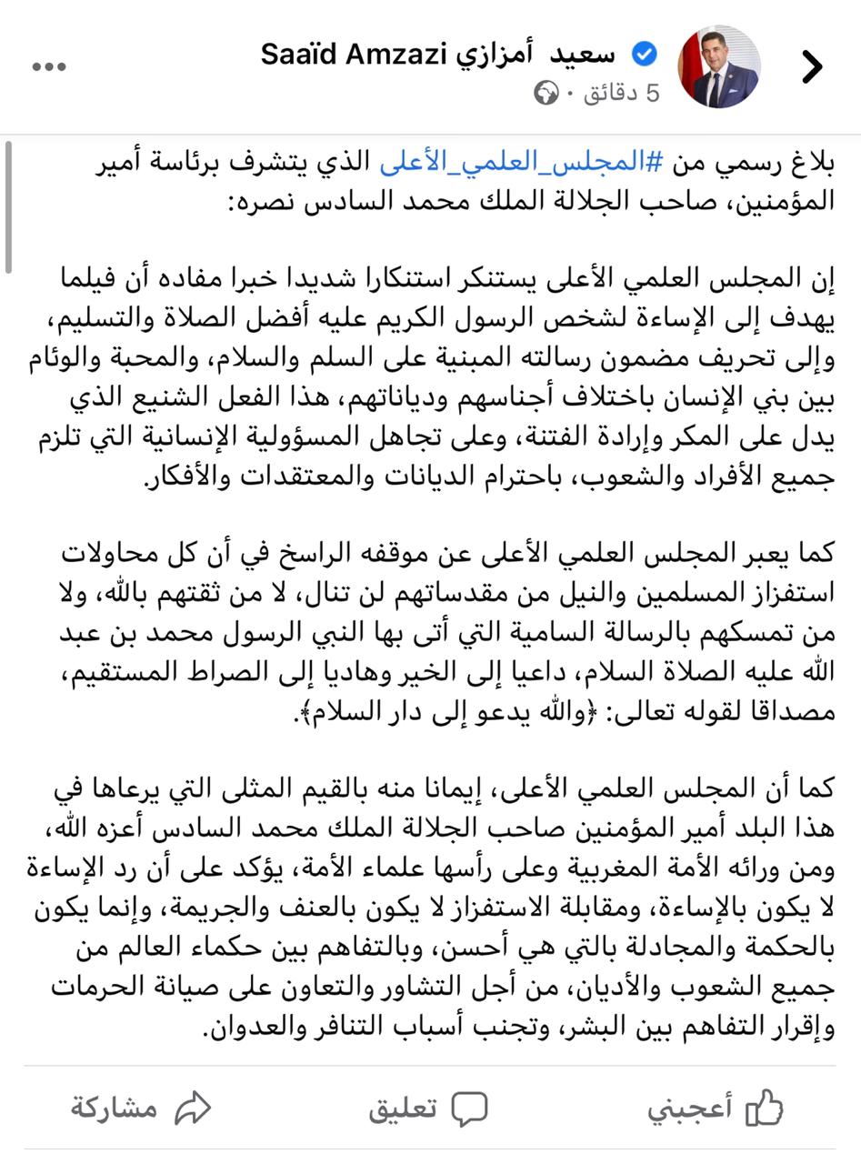 نشر سعيد أمزازي، الناطق الرسمي باسم الحكومة، مساء اليوم السبت 24 أكتوبر، على حسابه الرسمي على فيسبوك بلاغا للمجلس العلمي الأعلى حول الإساءة لرسول الله ﷺ، ليعود بعد وقت قريب ويحذفه.