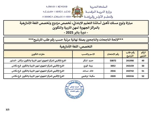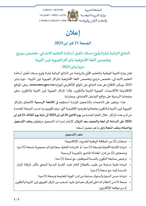 النتائج النهائية لمباراة ولوج مسلك تأهيل أساتذة التعليم الابتدائي، تخصص مزدوج وتخصص اللغة الأمازيغية بالمراكز الجهوية لمهن التربية – دورة يناير 2025.