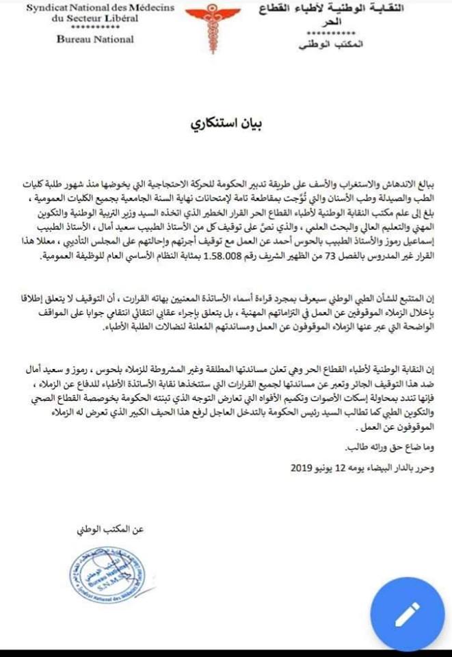 النقابة الوطنية لأطباء القطاع الحر تعتبر قرار أمزازي انتقاميا وتعلن تضامنها المطلق مع الأساتذة الموقوفين (وثيقة)