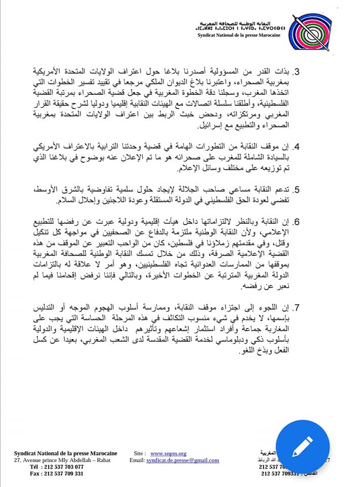 وأوضحت النقابة، أنه تم نشر في وقت سابق بلاغ، حول اعتراف الولايات المتحدة الأمريكية بمغربية الصحراء، كما تم اعتبار أن بلاغ الديوان الملكي مرجعا في تقييد تفسير الخطوات التي اتخذها المغرب، وسجلنا دقة الخطوة المغربية في جعل قضية الصحراء بمرتبة القضية الفلسطينية، وأطلقنا سلسلة اتصالات مع الهيئات النقابية إقليميا ودوليا لشرح حقيقة القرار المغربي ومرتكزاته، ودحض خبث الربط بين اعتراف الولايات المتحدة بمغربية الصحراء والتطبيع مع إسرائيل.