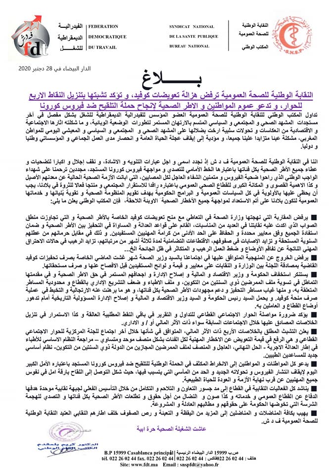 وعلى صعيد آخر، دعت النقابة كل المواطنات والمواطنين إلى الانخراط المكثف في الحملة الوطنية للتلقيح ضد فيروس كورونا، باعتباره الأمل الكبير لإيقاف انتشار الفيروس.