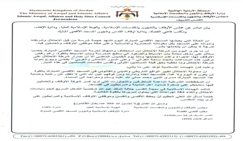 وناشدت الهيئات الإسلامية في مدينة القدس، العاهل الأردني، عبد الله بن الحسين، بـ”التدخل السريع لِلَجم سياسات الاحتلال وإلغاء كافة إجراءاته التي يحاول تمريرها بالقوة”.